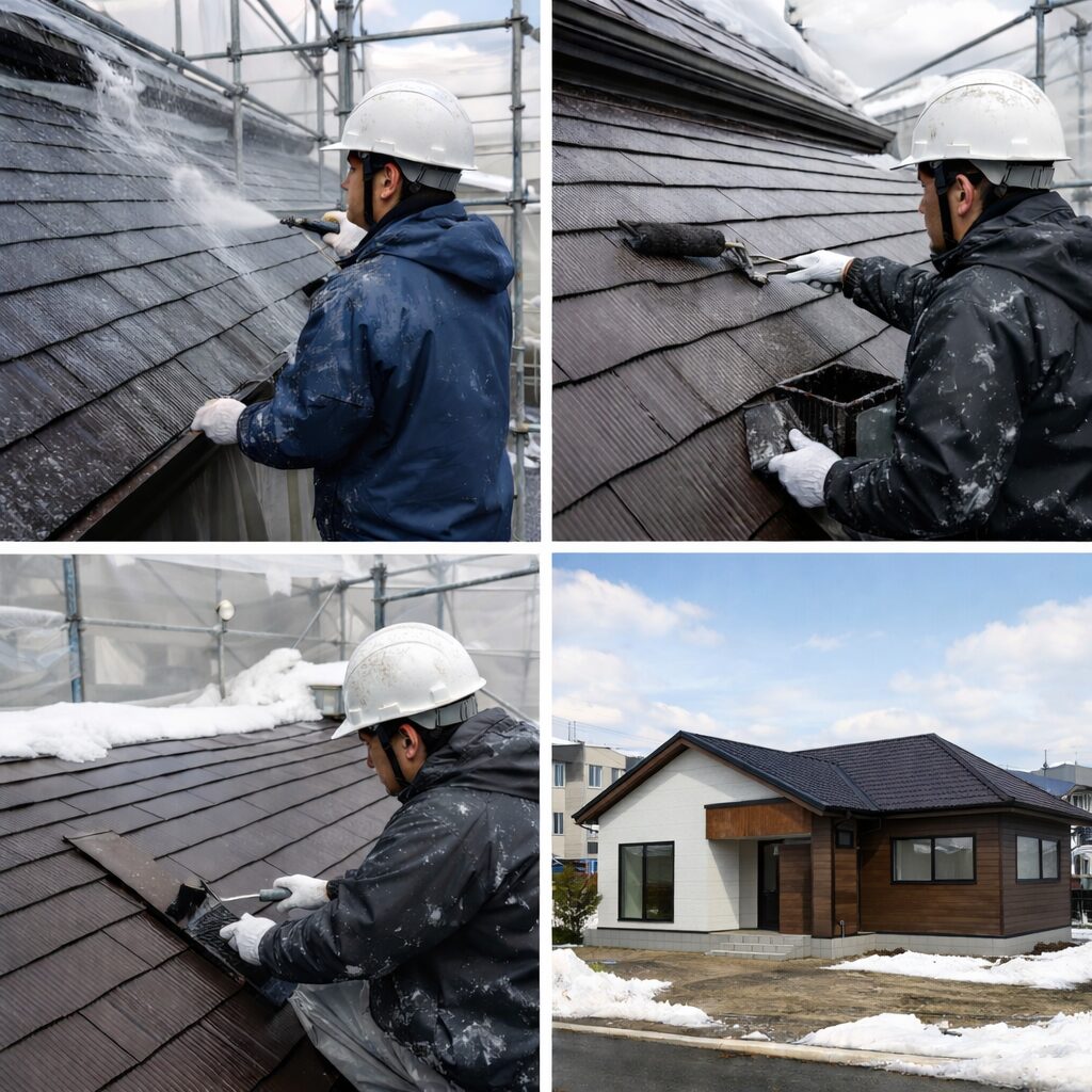 戸建住宅の屋根を対象に、塗り替え工事を行いました。積雪や紫外線による劣化を防ぐため、屋根材の状態に応じた塗料と施工方法で対応しています。外壁との調和も意識しました。