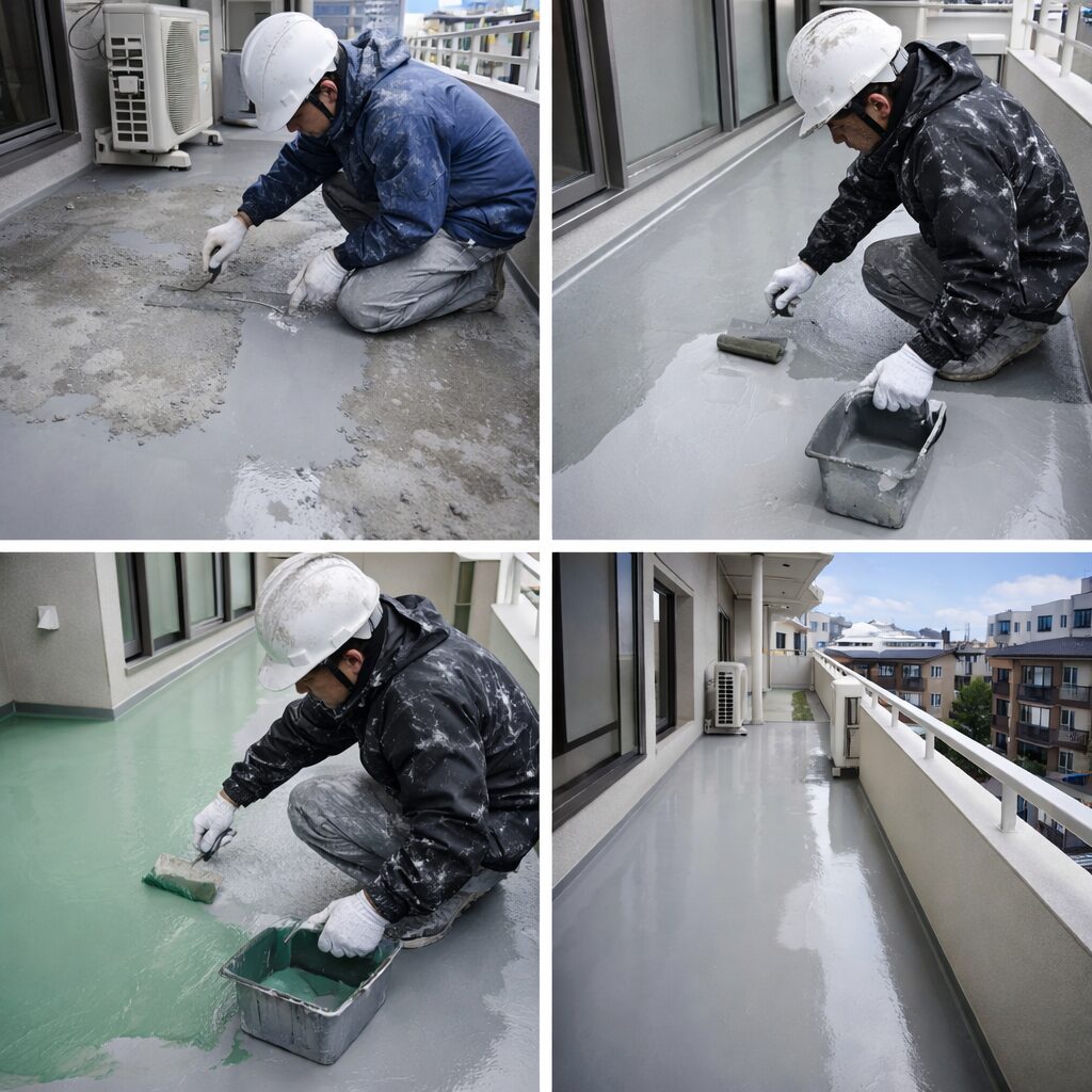 集合住宅のバルコニー部分に、防水塗装工事を行いました。経年劣化による防水性能低下に対して、下地補修を行ったうえでウレタン防水による塗膜防水を施工しています。